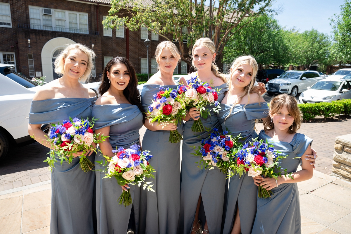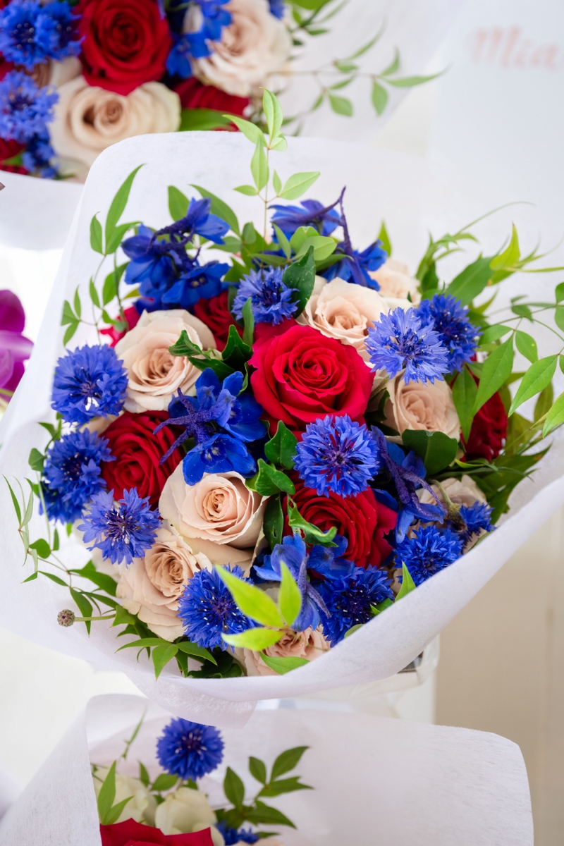 Extend this captivating beauty to your bridal party with our coordinating Bridesmaids’ Bouquets, thoughtfully designed to complement the bride’s bouquet with a harmonious selection of Cornflowers, Roses, and seasonal accents.
