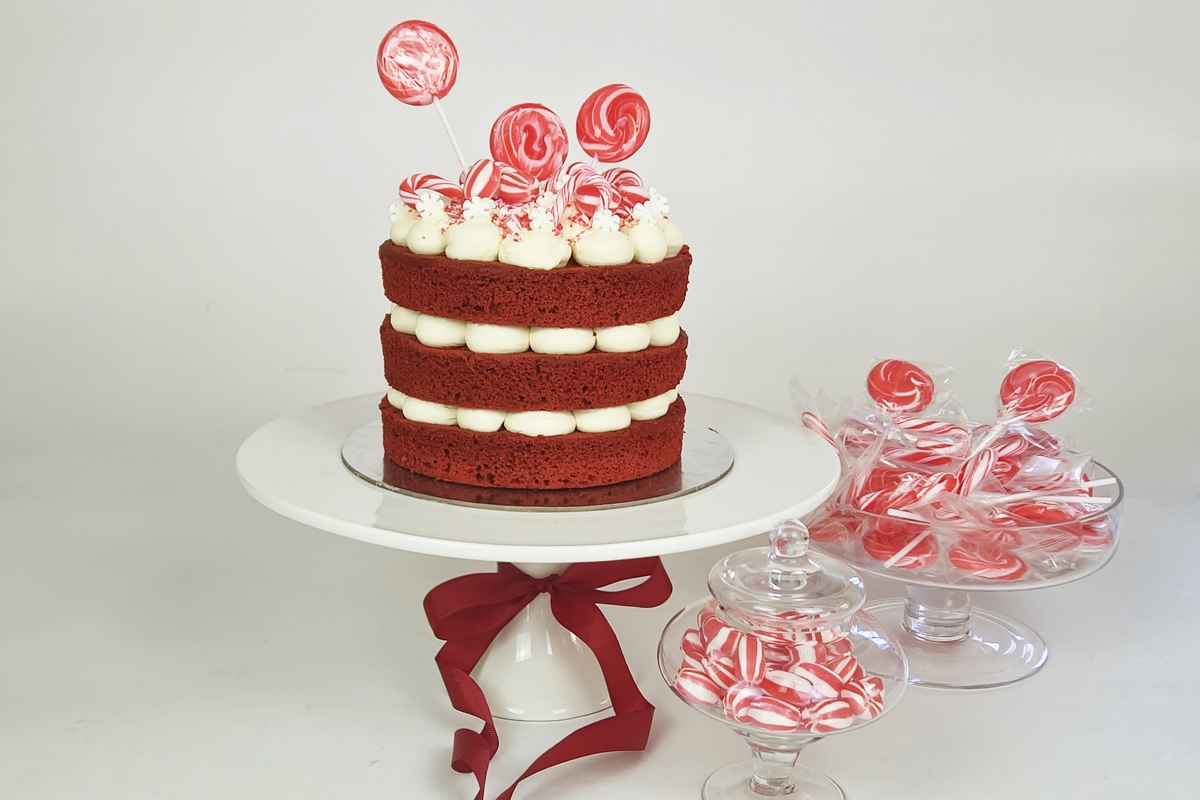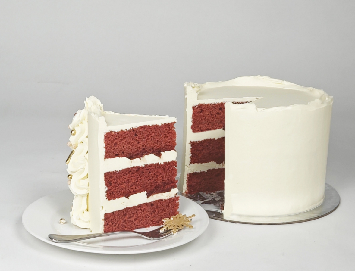- ✓ Red Velvet, Cheesecake-flavoured Swiss meringue buttercream + raspberry & vanilla jam
