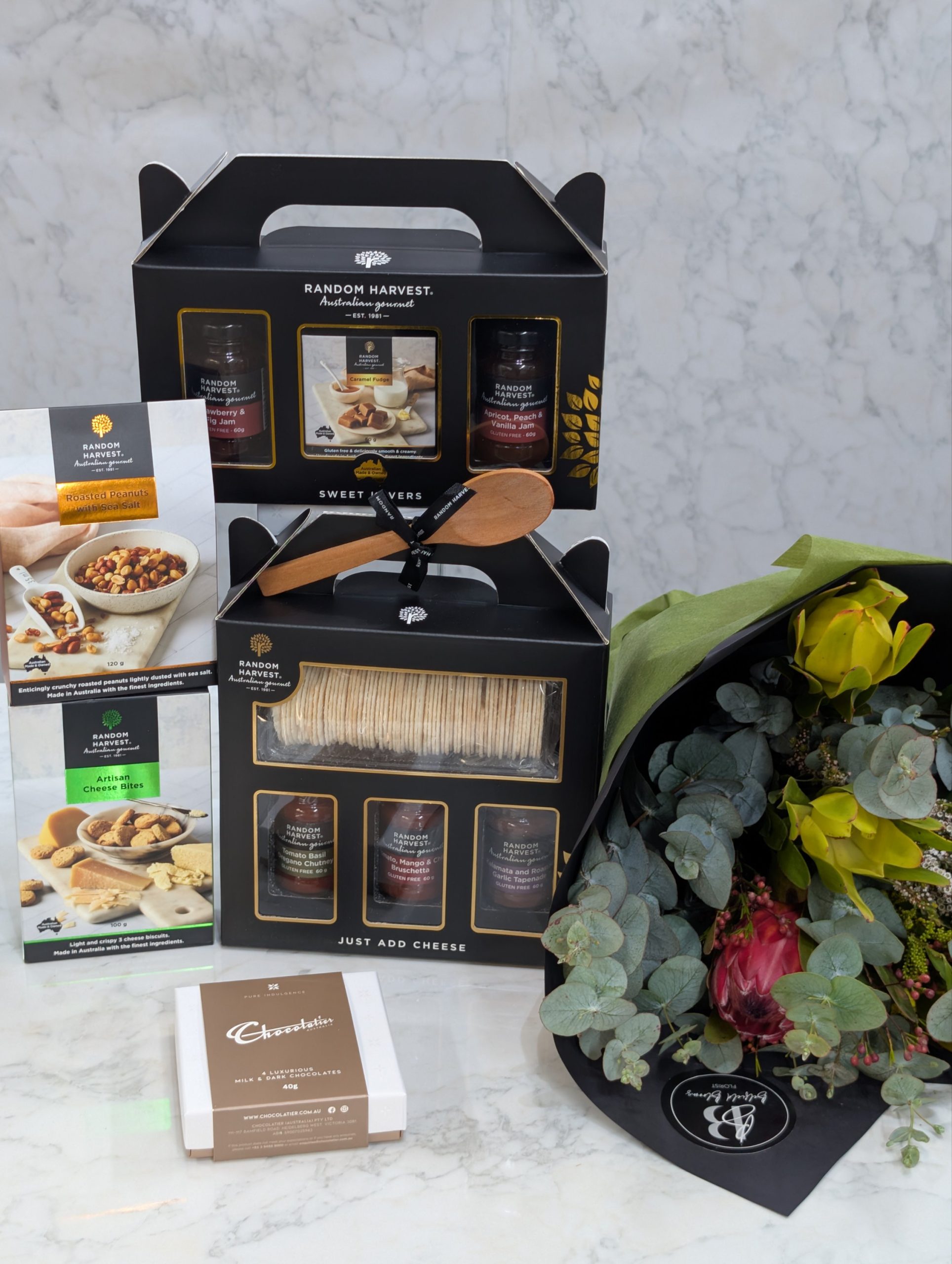 This arrangement features a striking mix of native flowers – including protea, banksia, and textured foliage – designed in a rugged, adventurous style that reflects strength and confidence. Paired with a carefully curated hamper of artisan sweet and savoury snacks, it’s the perfect balance of flavour and flair.