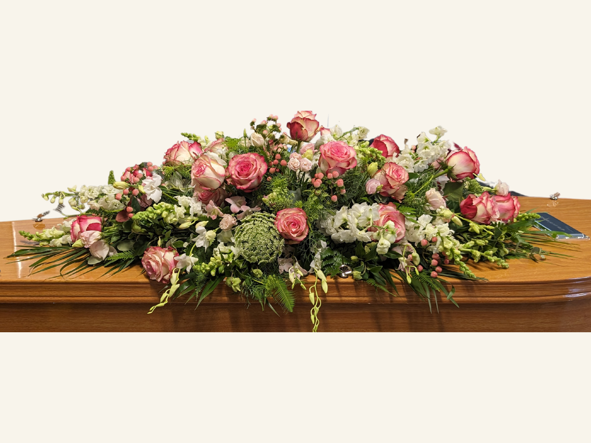 My Sister’s Keeper is a romantic garden casket cover designed with a soft, whimsical aesthetic. This refined arrangement features one premium rose variety — white roses with a delicate reddish-pinky edged finish — paired with carefully selected seasonal fillers to create a natural, garden-inspired look full of movement and texture.