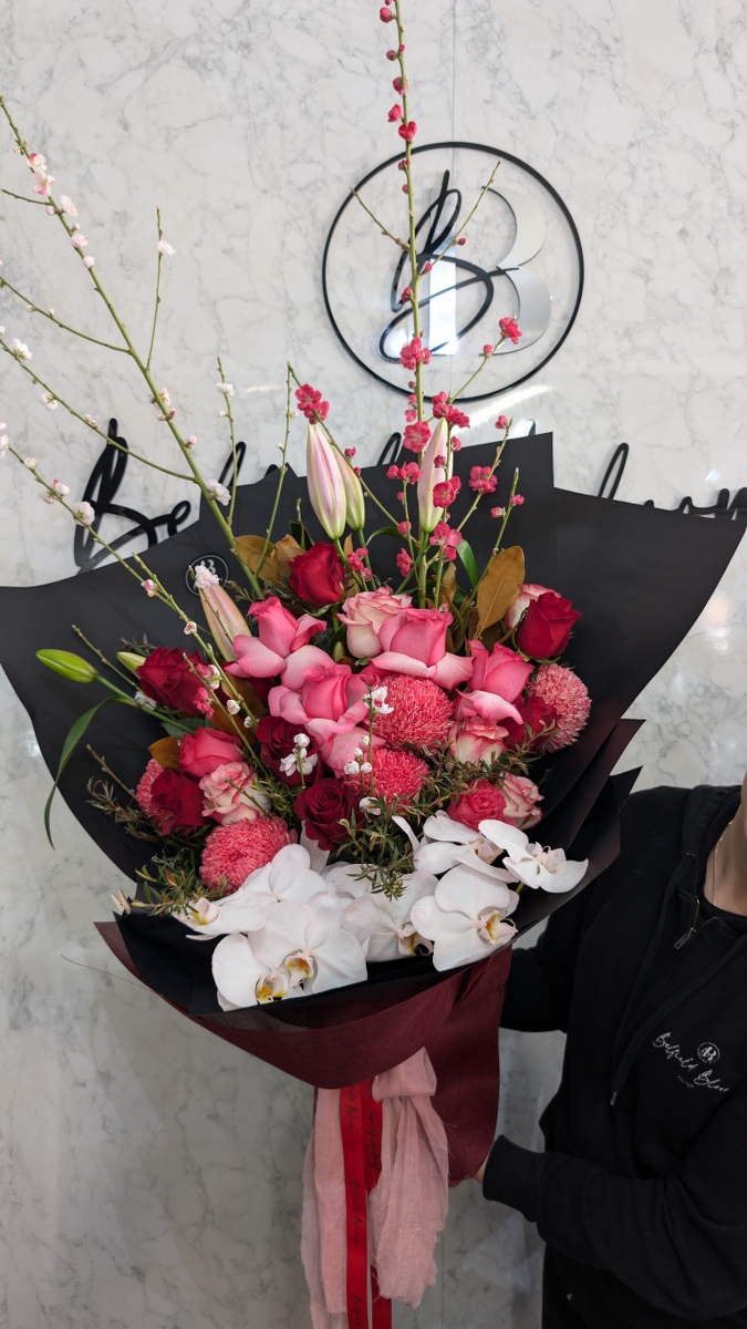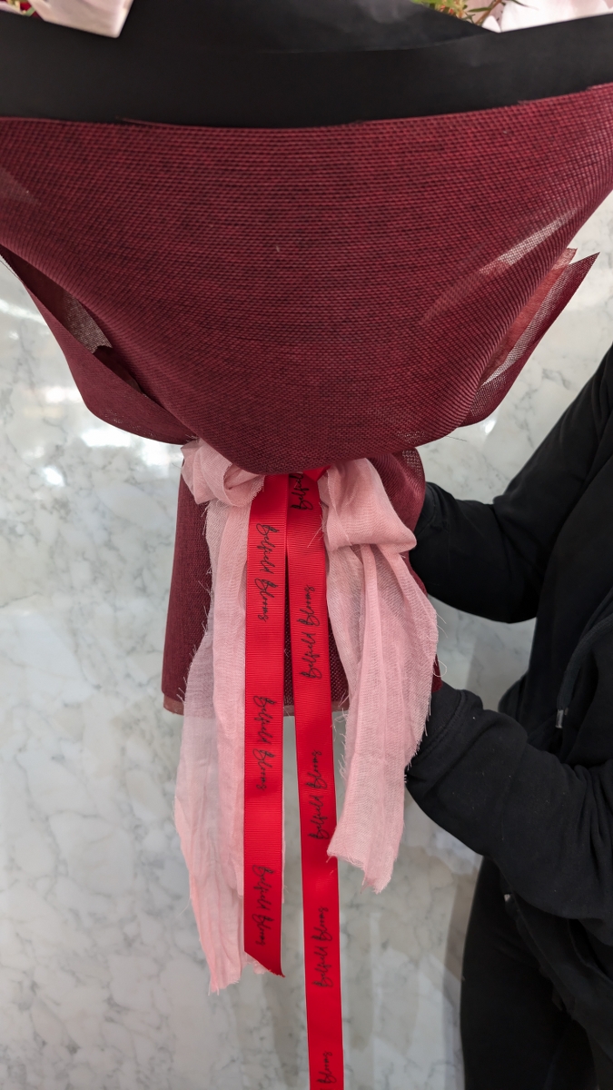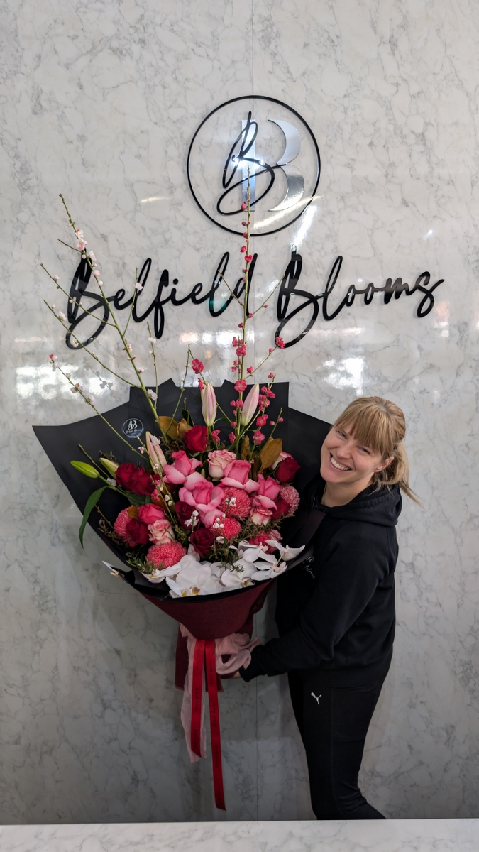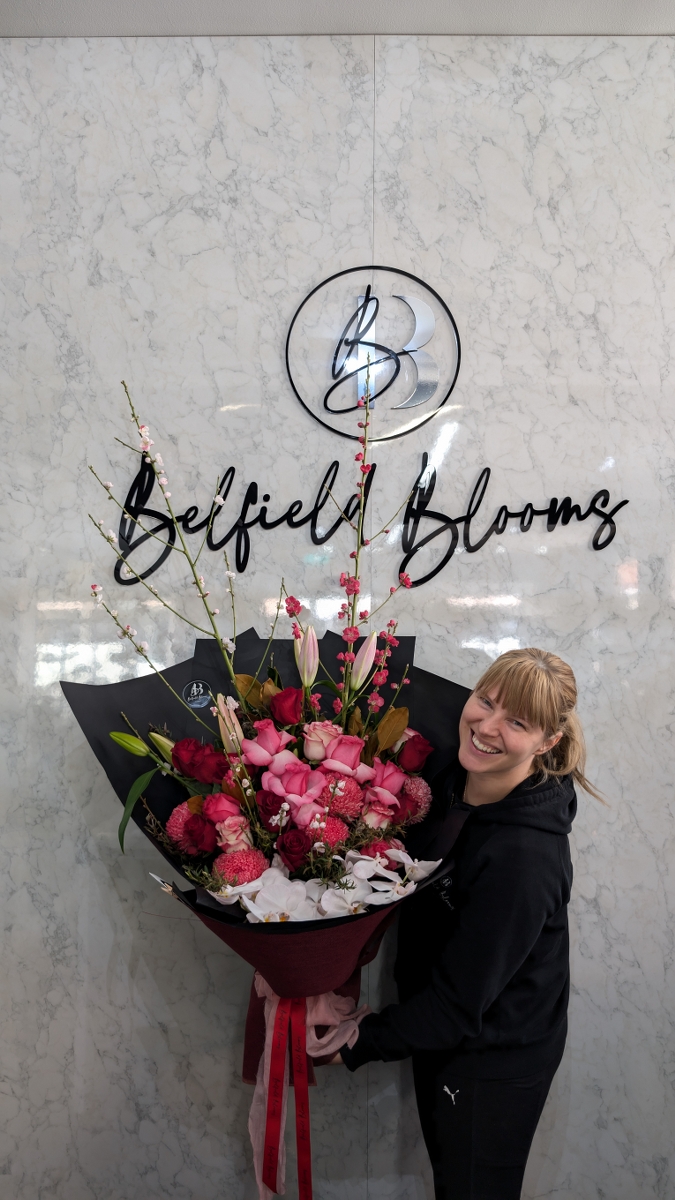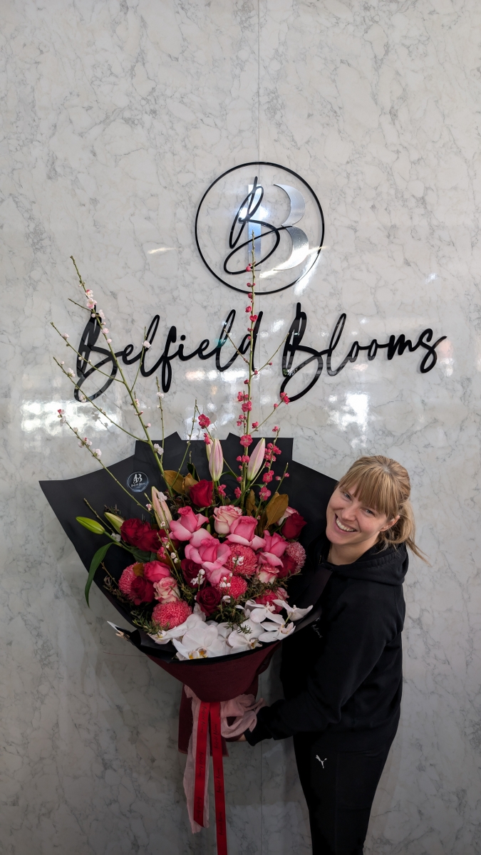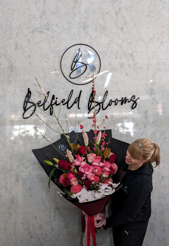Wrapped in Belfield Blooms’ signature style with luxury ribbons.