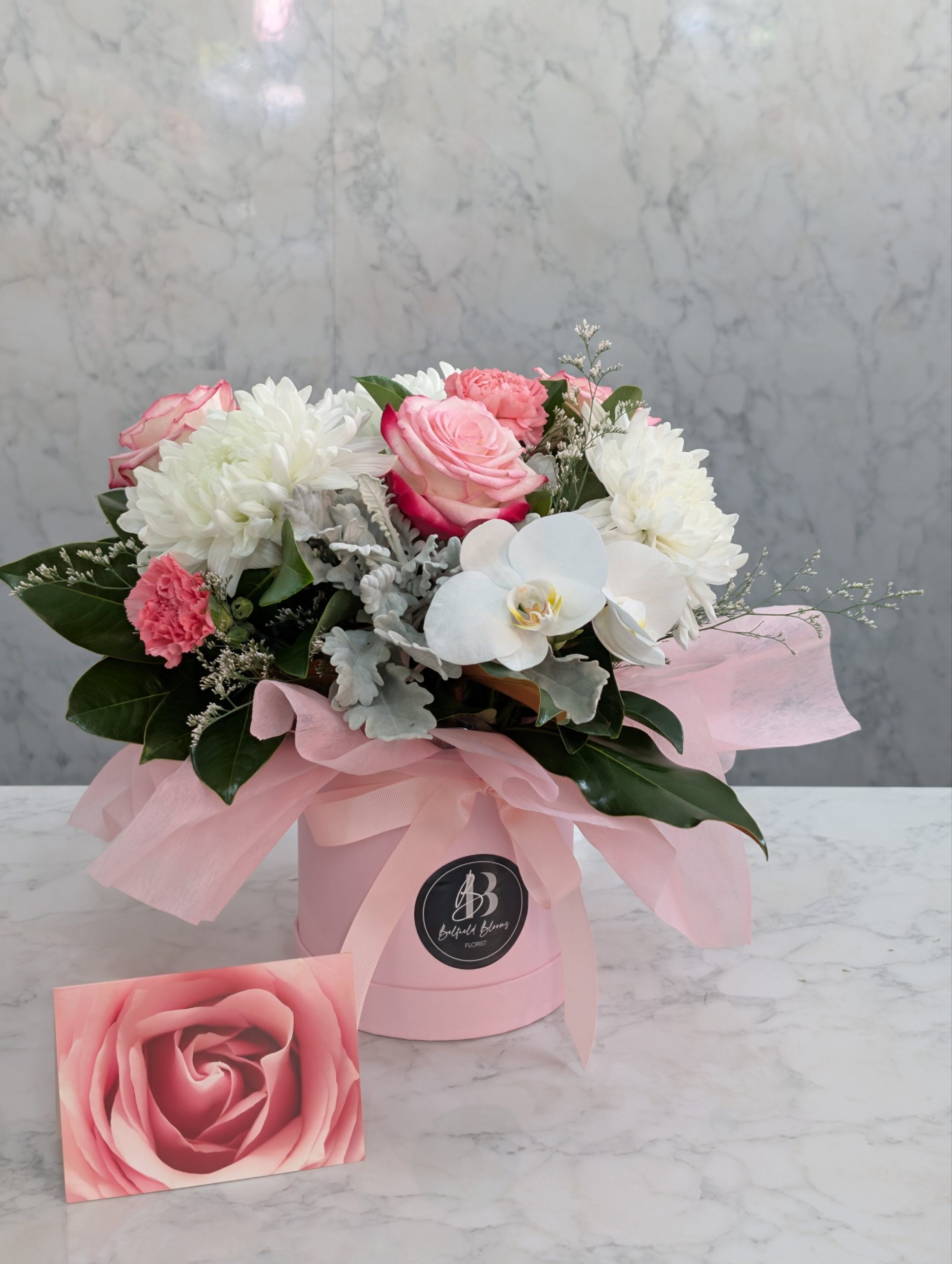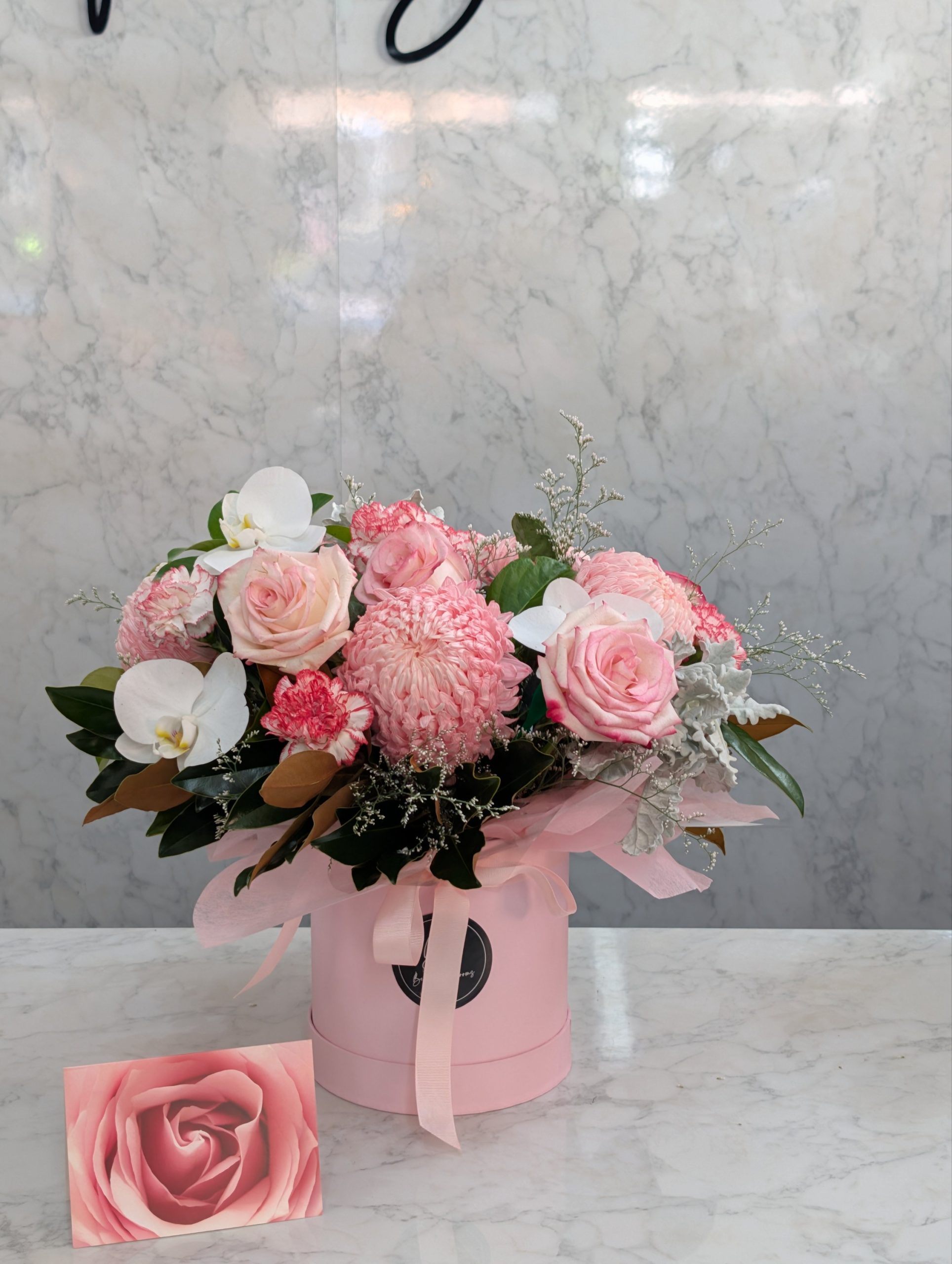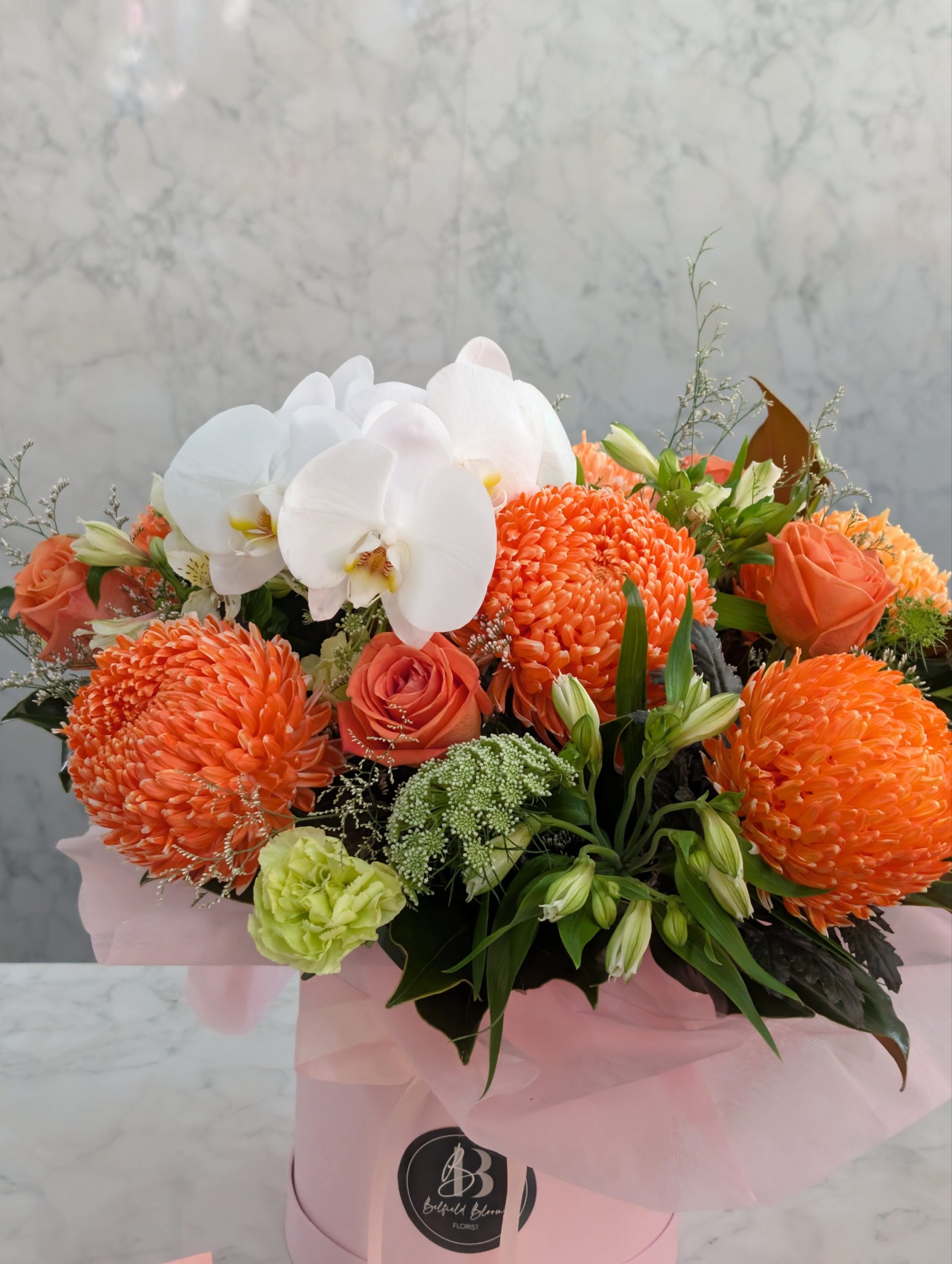 This premium hatbox arrangement features a curated mix of fresh seasonal blooms, highlighted with delicate orchid stems for a soft yet elevated look. The combination creates a layered, textural design that feels luxurious without being overly heavy.