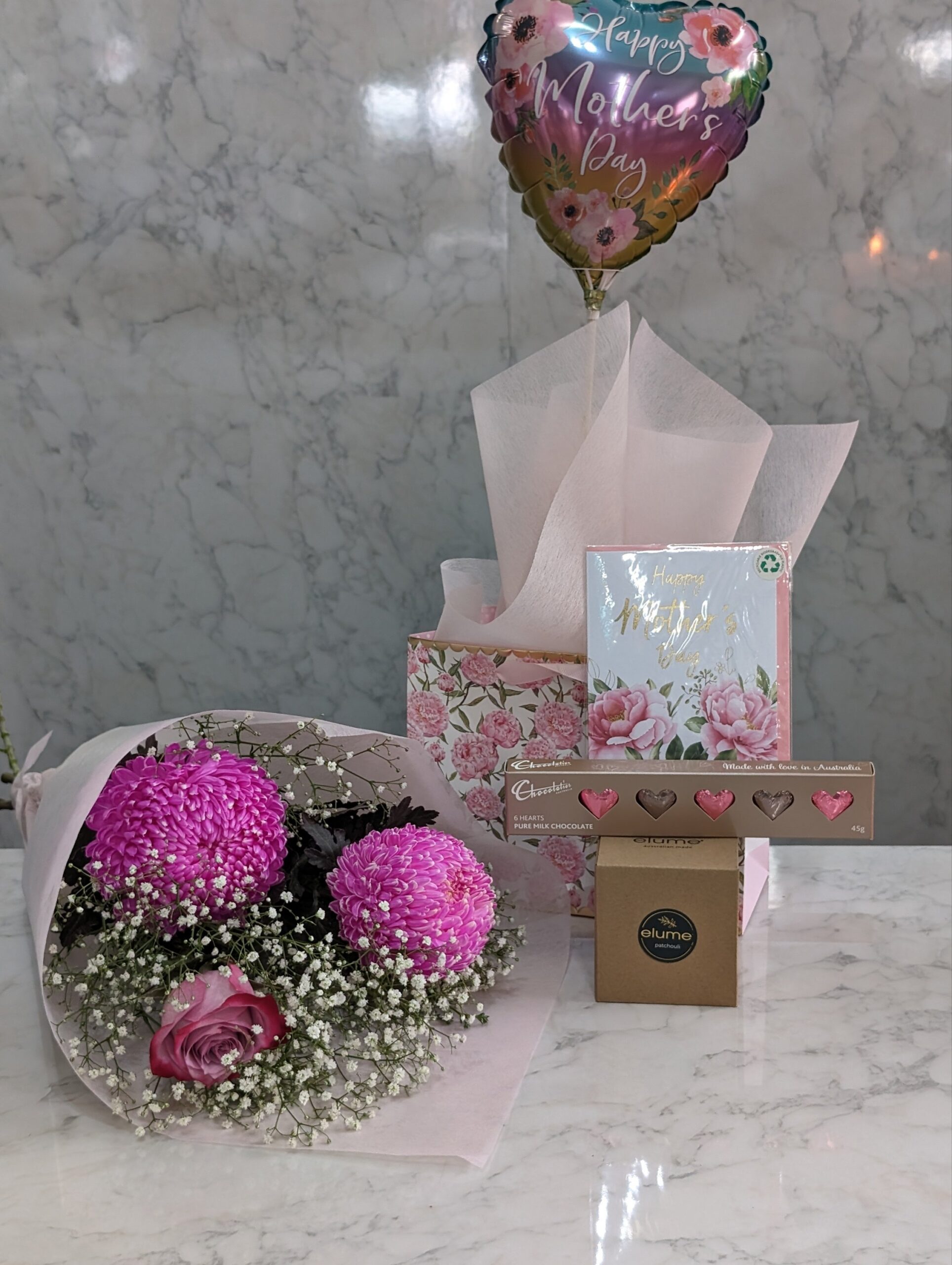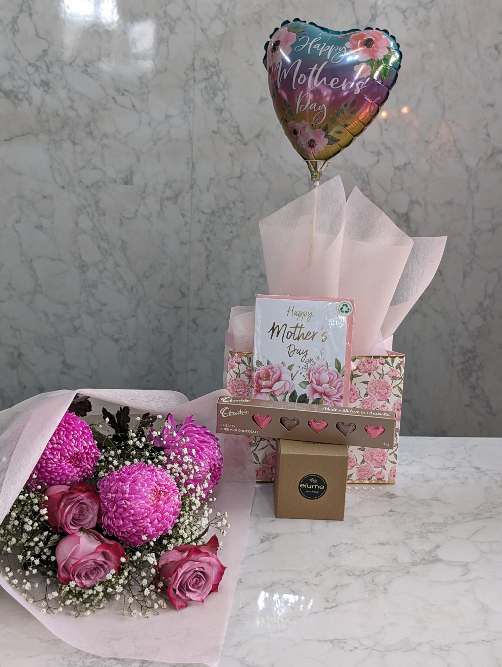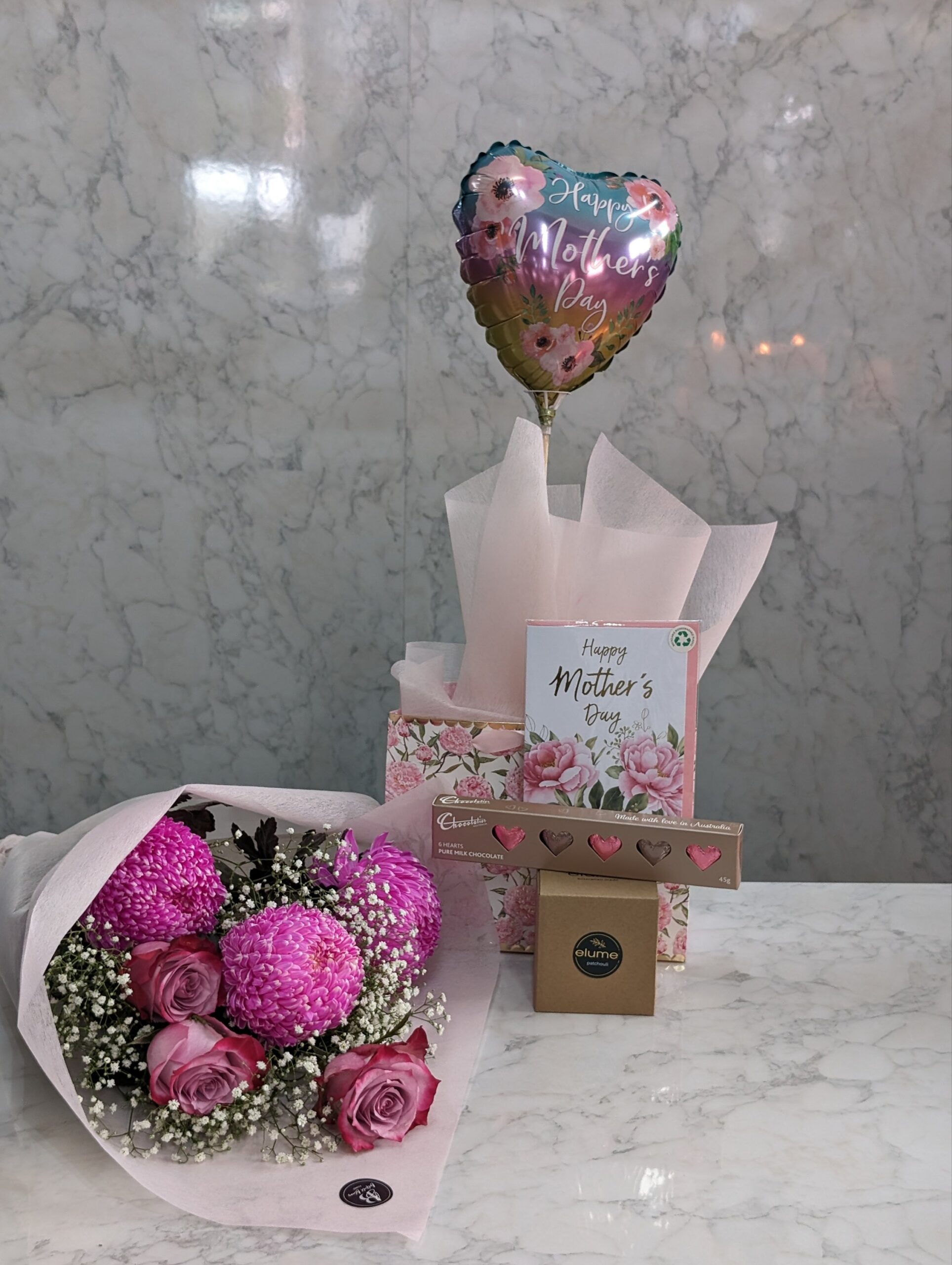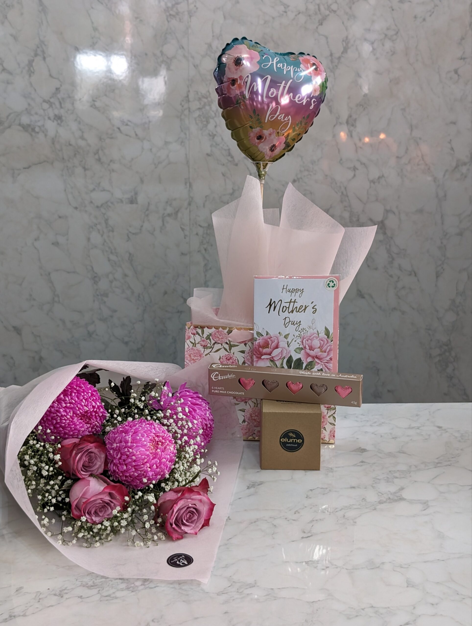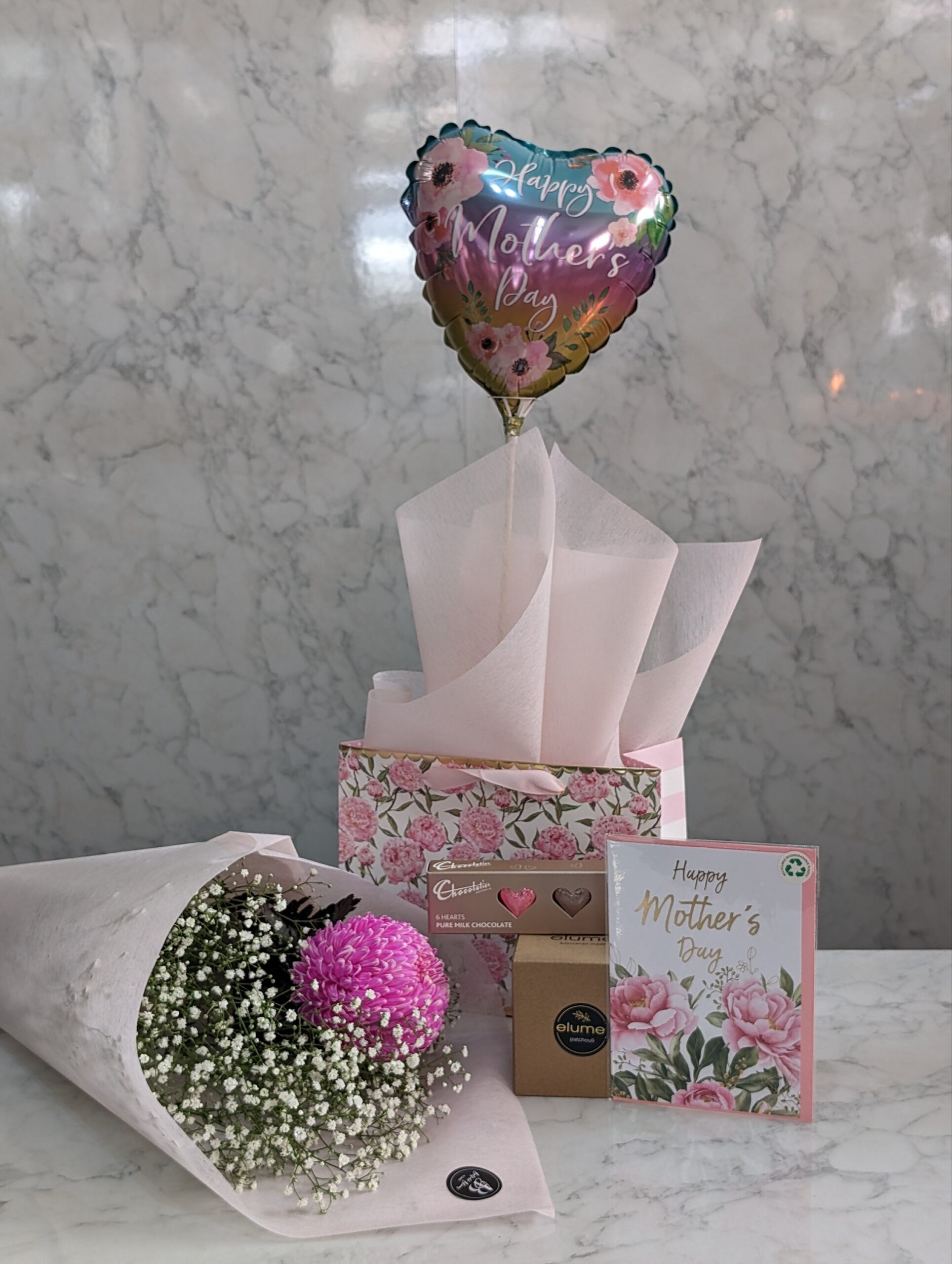 Beyond the flowers, the bundle includes a selection of handpicked gifts to indulge your mother and make her feel truly cherished. A luxuriously scented candle awaits to envelop her space in soothing aromas, creating a tranquil retreat for relaxation and reflection. Artisanal chocolates offer a taste of decadence, each bite revealing the meticulous craftsmanship and passion that mirrors her daily love and care. A heartfelt card accompanies the gifts, providing a personal canvas for you to express your feelings and gratitude. To infuse joy into the celebration, a festive balloon symbolizes the lightness and happiness she brings into your life.