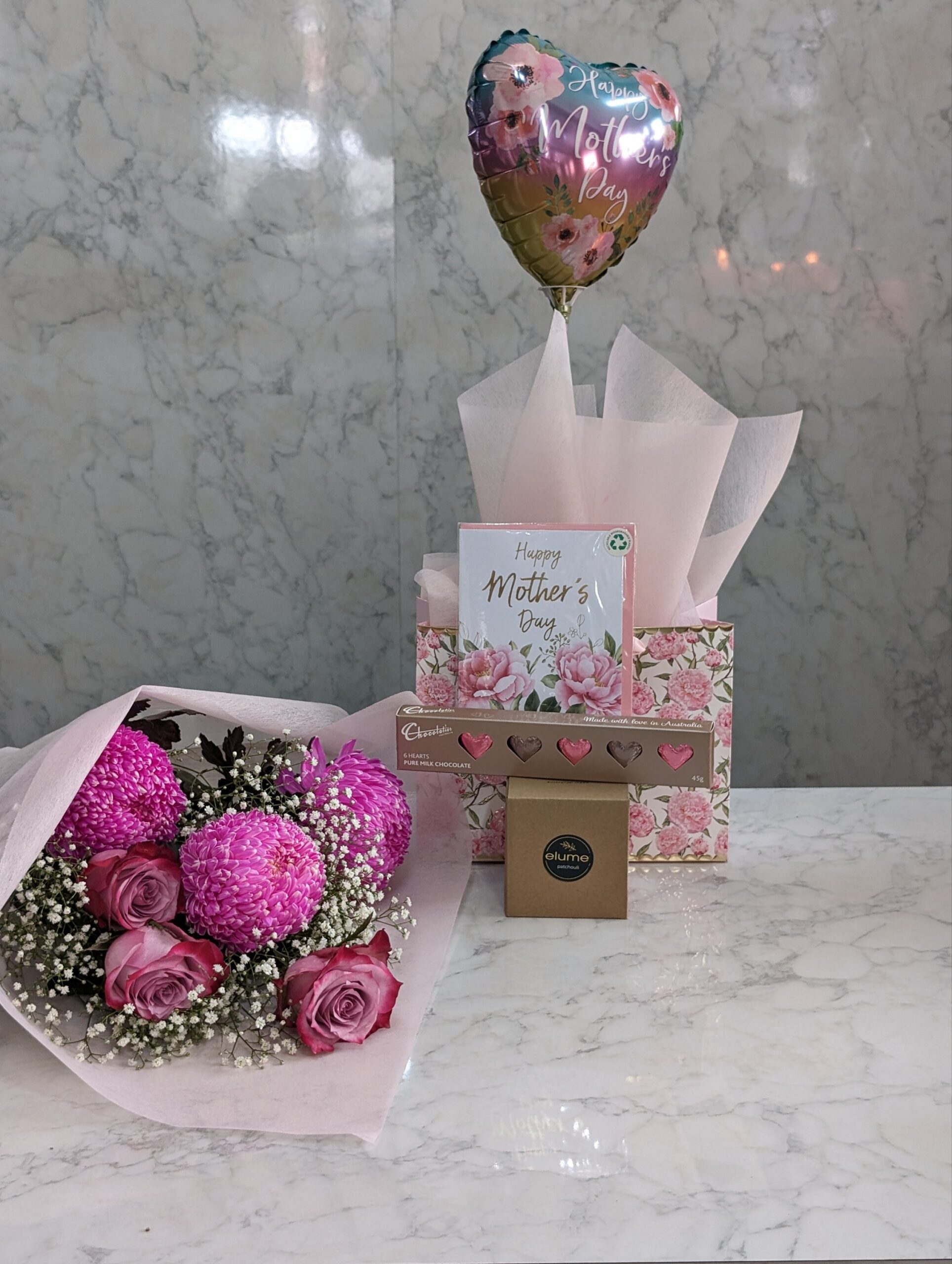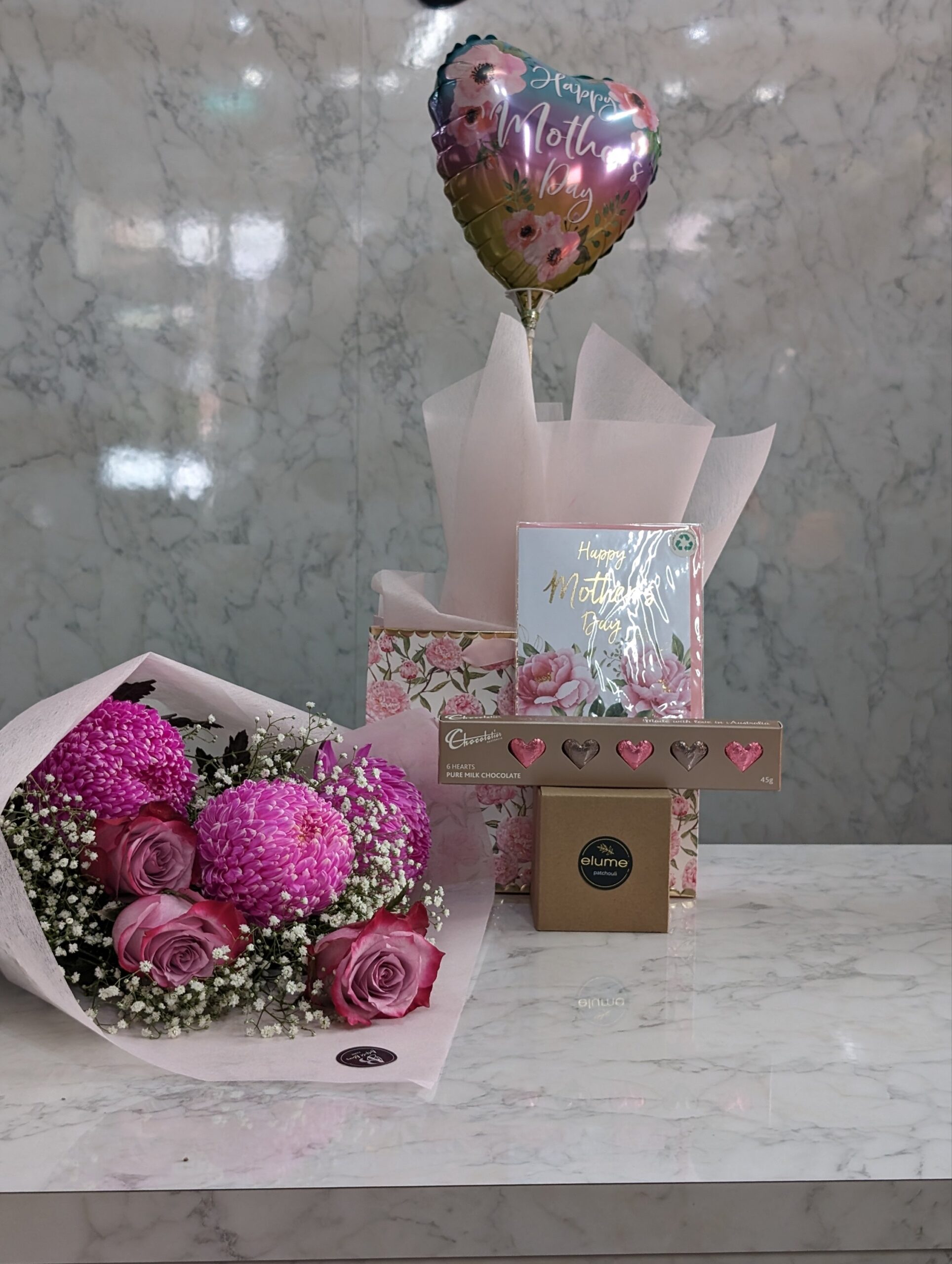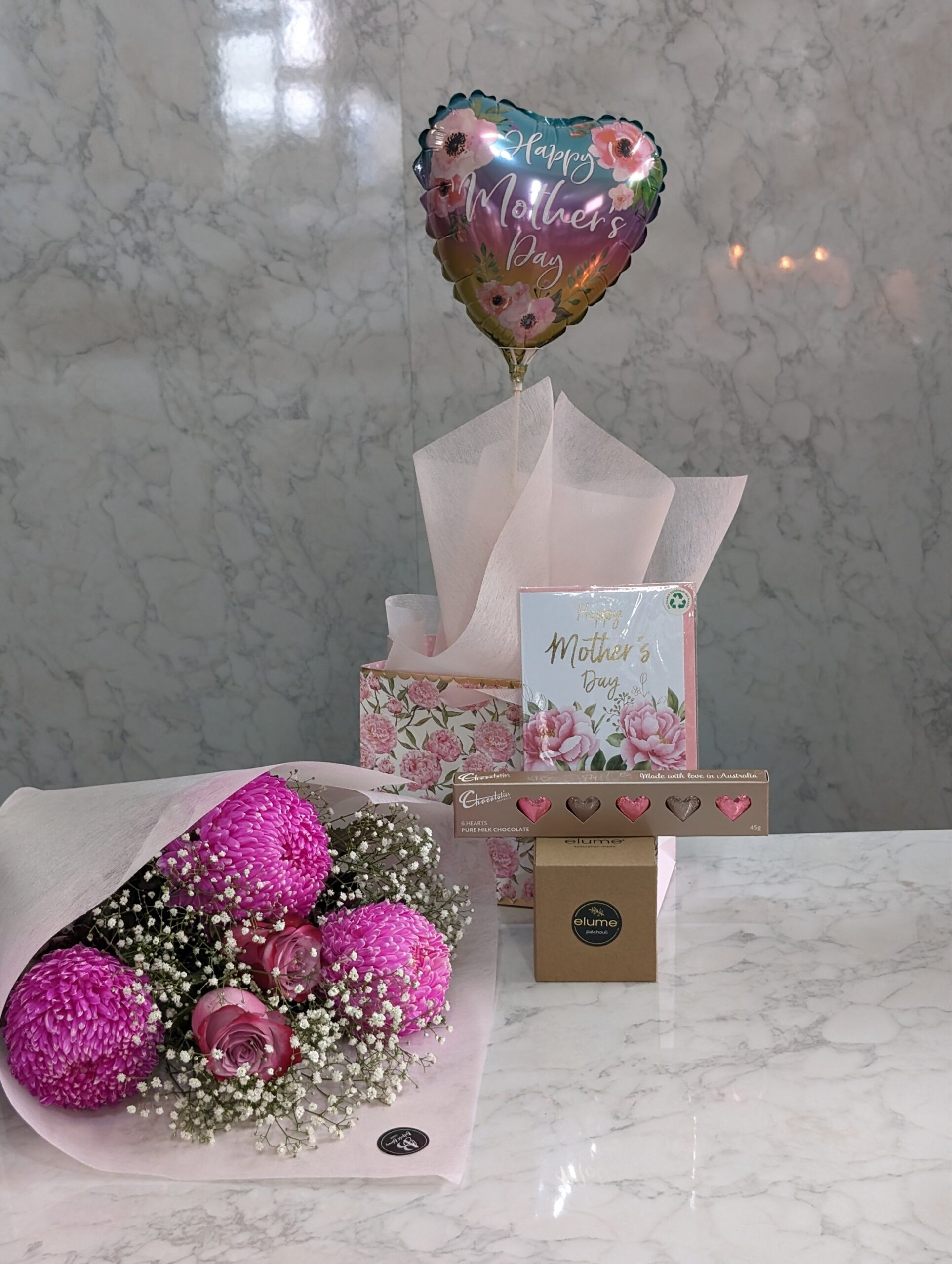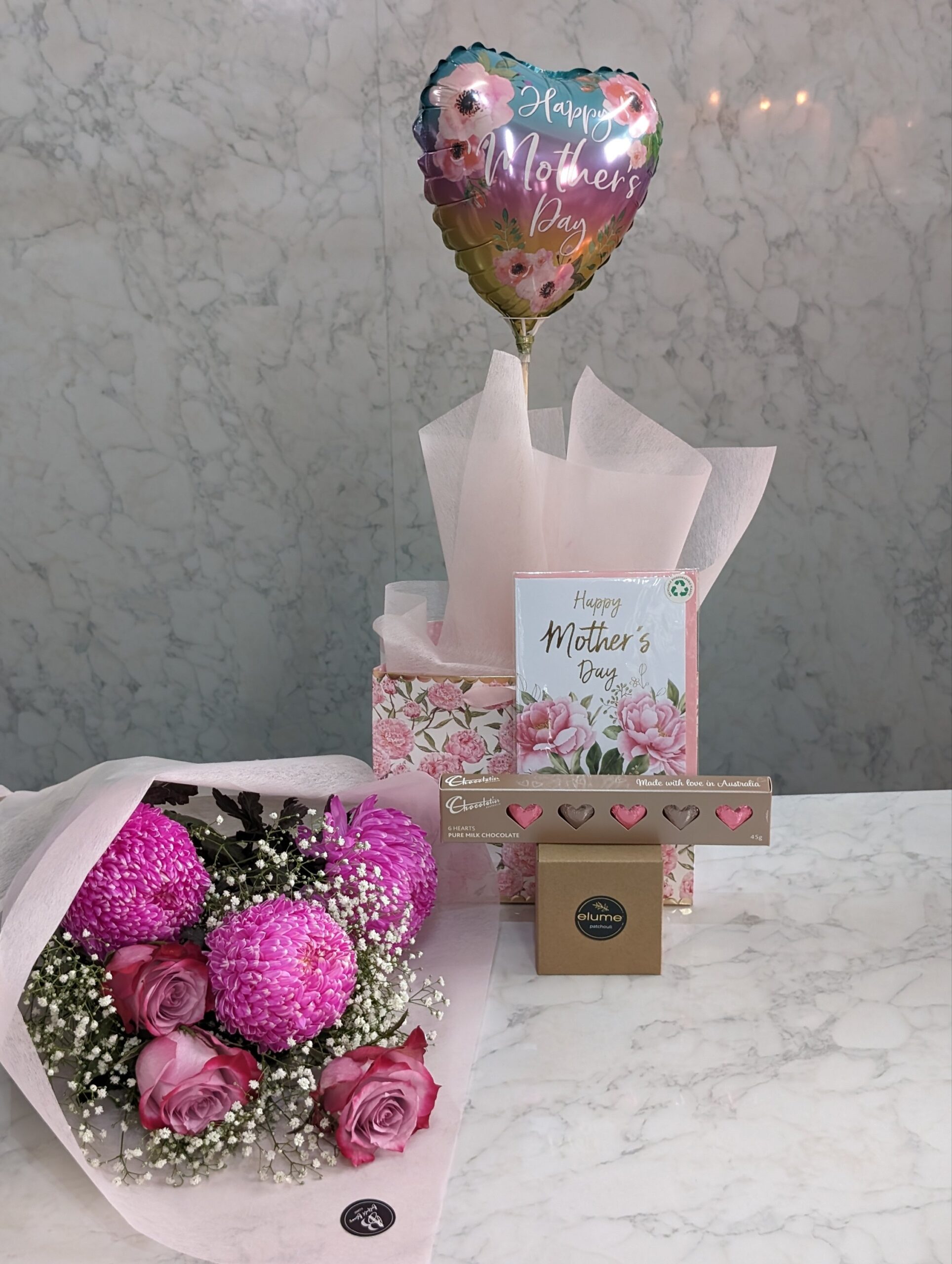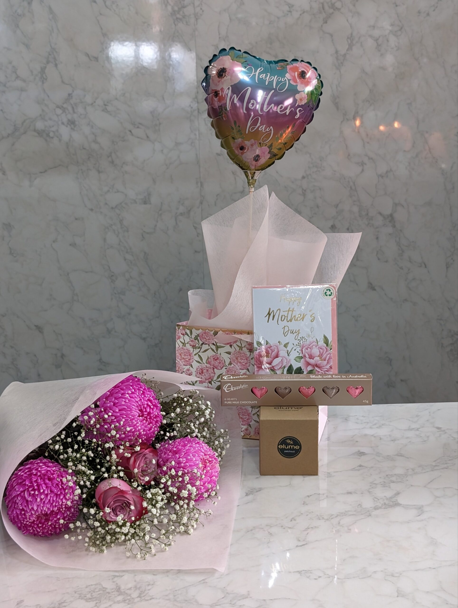 Beyond the flowers, the bundle includes a selection of handpicked gifts to indulge your mother and make her feel truly cherished. A luxuriously scented candle awaits to envelop her space in soothing aromas, creating a tranquil retreat for relaxation and reflection. Artisanal chocolates offer a taste of decadence, each bite revealing the meticulous craftsmanship and passion that mirrors her daily love and care. A heartfelt card accompanies the gifts, providing a personal canvas for you to express your feelings and gratitude. To infuse joy into the celebration, a festive balloon symbolizes the lightness and happiness she brings into your life.