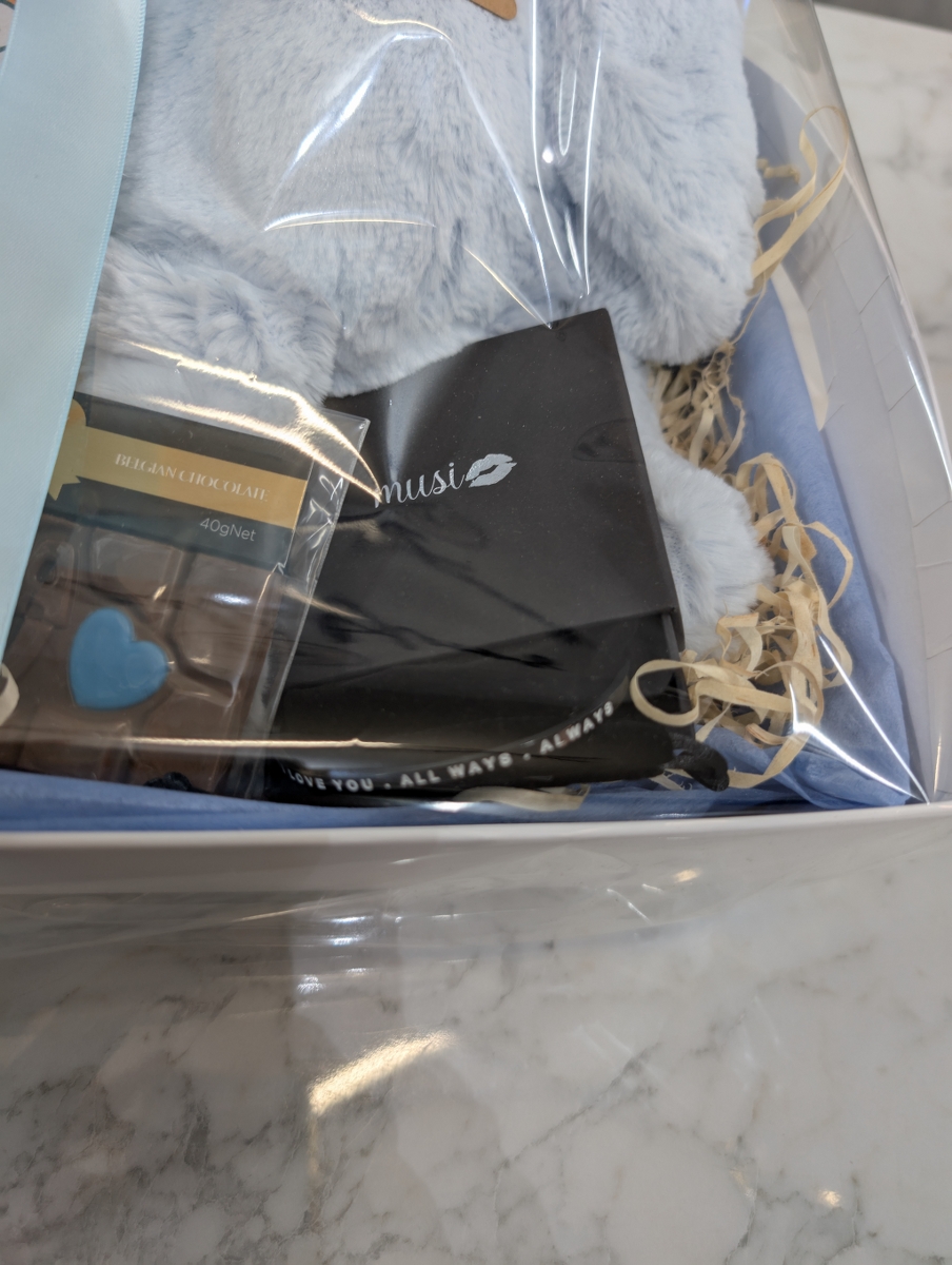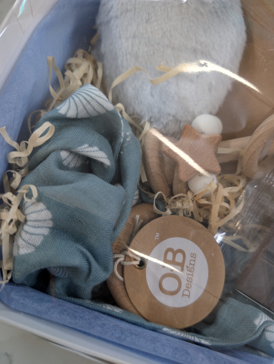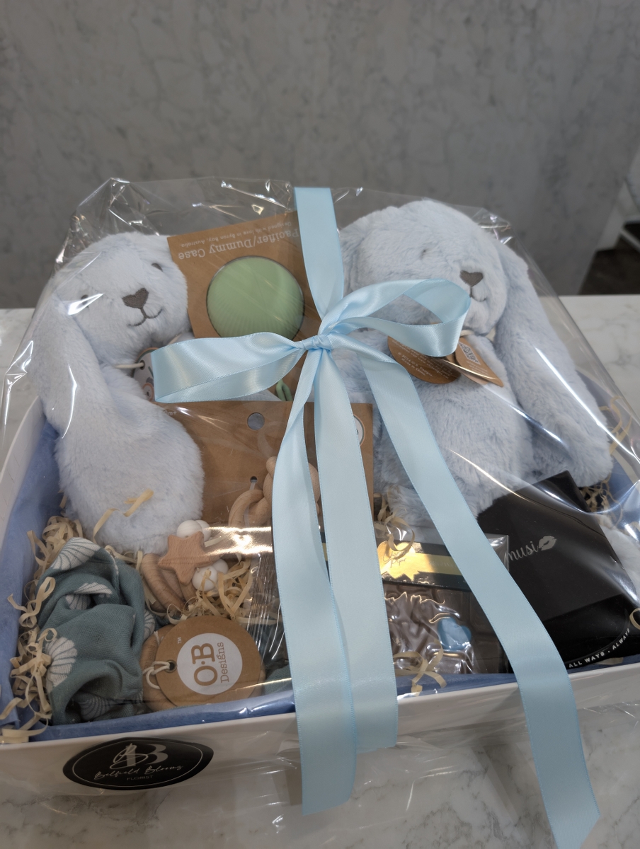 Celebrate the arrival of a precious baby boy with this thoughtfully curated gift hamper, filled with soft, practical, and stylish essentials for little ones and their parents. Beautifully presented in a gift box and finished with a satin blue ribbon, it’s the perfect way to welcome a new bundle of joy.